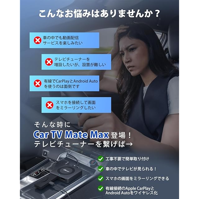 【Car TV Mate Maxご購入前に必ずご確認ください】基本的に2016年以降の有線CarPlay搭載車両のみ対応しています。無線接続可能なCarPlay搭載車両には対応していません。純正品以外の市販品カーナビやディスプレイオーディオには対応していません。BMWシリーズには対応していません。※パッケージは現在更新中です。主に『Car TV Mate Max』のパッケージを使用していますが、一部のパッケージには『Car TV Mate』の表記が含まれる場合があります。予めご了承ください。ご不明点がございましたら、お気軽にお問い合わせください。