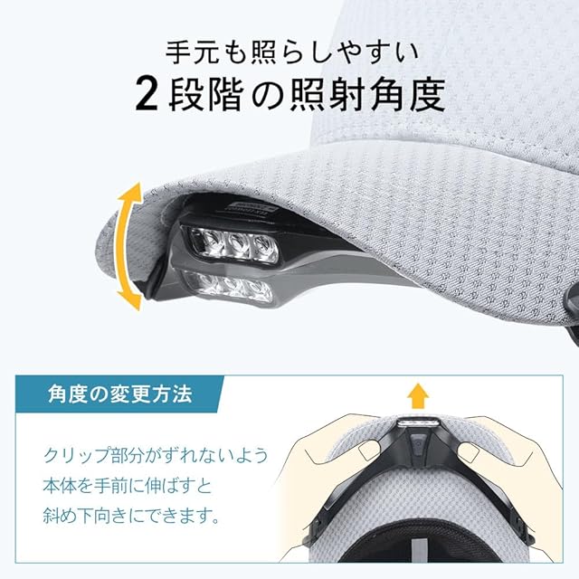 キャップのツバに取り付けるLEDライトです。防水なので、アウトドアやランニング・釣りなどにおすすめ。<br><br><特長><br>●キャップのツバ部分に取り付けるLEDライトです。<br>●クリップでキャップのツバを挟み込むので、落ちにくくなっています。<br>●ツバの内側に取り付けるので、目立ちにくくなっています。<br>●照射角度は、正面と斜め下向きの2段階で、用途によって角度を変えられます。<br>●明るさは3段階で調整可能です。<br>●防水規格IPX4対応で、汗や雨に強いので、アウトドアやランニング・釣りなどにおすすめです。<br>●付属のケーブルで充電できるので、繰り返し使用できます。<br><br><仕様><br>■製品サイズ:約W169×D85×H52mm<br>■重量:約48g<br>■製品パッケージサイズ:約W115×D42×H195mm<br>■製品パッケージ重量(製品含む):約116g<br>■明るさ/強点灯時:約250ルーメン、中点灯時:約100ルーメン、弱点灯時:約50ルーメン<br>■充電時間:約2時間30分<br>■連続使用時間:強点灯時で2.5時間、中点灯時で約5.5時間、弱点灯時で約8時間<br>■光源:昼白色LED×3個、3段階明るさ調整可能<br>■電源:リチウムポリマーバッテリー内蔵(660mAh)<br>■対応サイズ:ツバ幅160~180mm、ツバ厚さ3~5mmに対応<br>■付属品:充電ケーブル(約20cm・USB Type-Cコネクタ)<br>■期間:ご購入日より6ヶ月<br>■原産国:中国<br>■取扱説明書:あり(日本語)<br><br>・小口輸入品につき、運搬の際製品、箱などに汚れ、キズができる場合がございます。