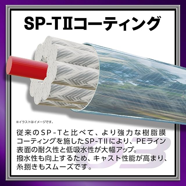 ラインタイプ: 縦編み・9本撚りPEライン 【コアインプット製法 [マックスパワー 原糸8本撚り+高強力原糸 (高分子ポリエチレン) 中芯]】 / ラインコーティング: 「SP-T II」「SP-V」採用