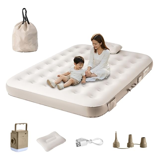 【高性能電動ポンプ内蔵&ワンタッチ操作】 こちらのキャンプ用エアーベッドには、まるで魔法のような電動ポンプが内蔵されています。ボタン一つで、たった2~3分で簡単に空気入れ・空気抜きができます。お好みに合わせてエアーマットの硬軟度を調整することもできます。さらに、電動ポンプは取り外して単独で使用でき、付属の3種ノズルを取り付けて、他の用途にも適しています。大容量の2600mAhバッテリーとライト機能(弱光/強光/SOS)も搭載されており、キャンプの夜をより楽しく過ごします。