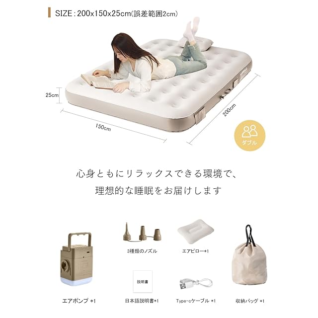 【部品が揃っている&安心】パッケージ内容:エアーベッド本体、エアーピロー(シングル:1つ、ダブル:2つ)、Type-C充電ケーブル、収納バッグ、修補用パッチ、3種類類ノズル、電動ポンプ(内蔵)、日本語取扱説明書。エアーベッドを購入日から12ヶ月間のがが付いております。製品に関してご不明な点がございましたら、お気軽に当店までお問い合わせください。