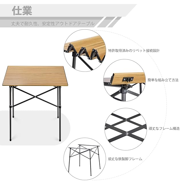 <b>ブランドストーリー<b><br> Timber Ridgeは、全国的の音楽祭でアウトドア用品のコレクションを見つけた若者から始まりました。 コンパクトで快適で耐久性のあるものなので、キャデラックに持ち込んで冒険を始めることができます。<br> これらは、Timber Ridge設計の後ろにあるコアアイデアです。これから、私たちはお客様の助けを借りて、フィードバックと革新のコミュニティに成長してきました。Timber Ridgeをご利用いただき、ありがとうございます。アドベンチャーに入りましょう!<br><br><br> <b>商品の詳細:<b><br> [展開サイズ]:(約))長さ70cm*幅70cm*高さ70cm<br> [折りたたんだサイズ]:(約)長さ71cm*幅18.5cm*高さ5.6cm<br> [梱包サイズ]:(約)長さ72.5cm×幅11cm×高さ19cm<br> [重量]:(約4.2kg<br> [耐荷重]:(約)45kg<br><br> [フレーム素材] : 鉄製<br> [付属品]:収納袋<br> [天板素材] :アルミ製<br><br><br> <b>●軽量&高耐荷重<b><br> ピクニックテーブルの素材にアルミニュウムと鉄を採用し、ちょうどいい4.2kgの軽さと普通の30KGよりもっと高耐荷重45KGを実現。<br><br> <b>●優れた仕業<b><br> ロールトップテーブルのフレームは鉄製で、安定性と耐久性、丈夫さUP!<br> テーブルの天板はアルミ製で、ネイルで接続されています。手を天板の中に巻き込まれない安全なデザインです。<br> 汚れてもすぐに拭き取ることが出来るのでお手入れも簡単です。<br><br> <b>●専用収納袋付き<b><br> フォールディングテーブルとしてアウトドアで使うときや使わない時の保管用に、持ち運び便利な収納袋付き。<br> 収納袋の中にはフレームと天板の2つ別々のスペースがあります。 輸送中の傷や損傷を防ぎるデザイン<br><br> <b>●コンパクト性<b><br> 折り畳み式テーブルはコンパクトに折りたためて屋外で使用する時や車のトランクに入れる時に便利。折りたためるから収納も場所を取りません!<br><br> <b>●簡単な組み立て方法<b><br> 脚フレームを均一に広げます。<br> 本体の天板ボールと付属の天板ボールを本体に繋げ合わせます。 <br> 天板を載せ、天板一辺の穴が脚フレームに差し込むように広げていきます。<br> 天板のもう一辺のロックが脚フレームのもう一辺にはまったら完成です。<br><br> <b>●自然との共存を体験<b><br> 海や山の大自然の中だけではなく、近所の公園や自宅の庭でも、 気軽に楽しむことができます。レジャーテーブルの機能性満々~自然が身近になれます。<br><br><br> <b>【ご注意】<b><br> ・天板に乗ったり踏み台代わりにしないで下さい。破損、転倒、ケガを負うおそれがあります。<br> ・必ず水平な場所でご使用下さい。転倒、ケガを負うおそれがあります。<br> ·商品は、モニターによって色合いが異なって見える場合があります。<br> ·商品の格好や個人的測量方法などが異なるので、1-3CMのがあるのも正常です。予めご了承ください。<br>