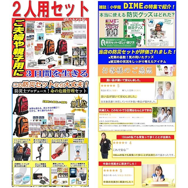 大切な家族を守る防災セットです。ご家族やご夫婦での避難に便利な、2人用の防災セットです。1人あたりの重量は、わずか約3キロの軽さなので、女性や高齢者の方でも、いざという時には走って逃げれるセットです。