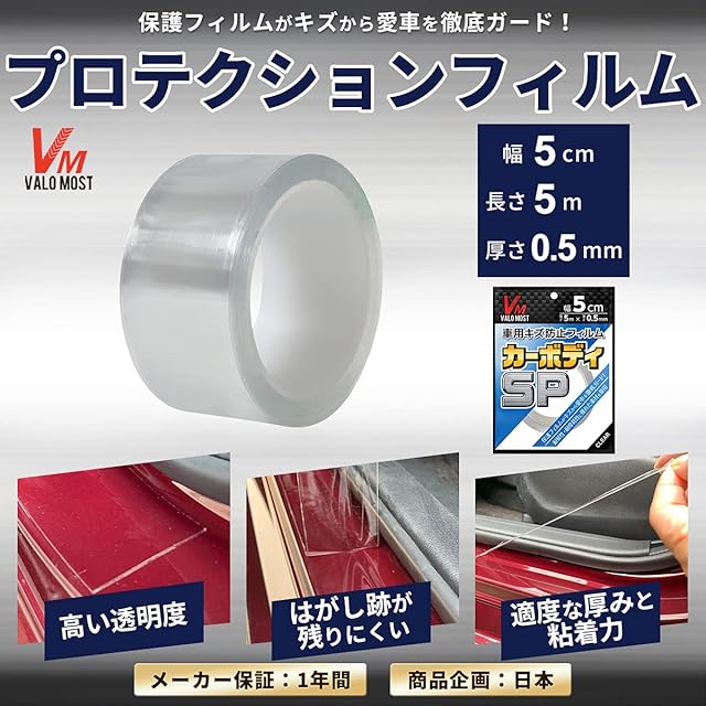 商品名:VALOMOST プロテクションフィルム 厚手仕様 車 バイク 保護 テープ 保護フィルム クリア 現役1級整備士監修 長さ5M 厚み0.5mm カーボディSP 幅5cm