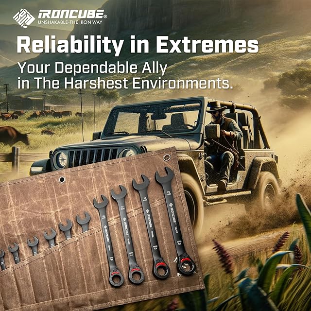 ラチェットレンチ DIY工具 整備士用 72歯 収納便利:リバーシブルレンチセット 12本組 8-19mm - タフブラック仕上げCR-V鋼製 IRONCUBE ワックスポーチ付き 父の日プレゼントに最適