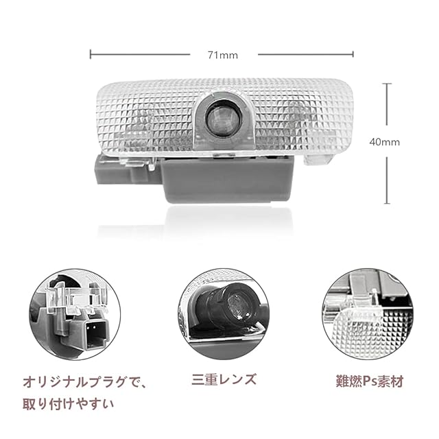 『高品質』:100%ブランドの新しい車のカーテシライト。LEDの寿命:100,000時間以上。純正カーテシランプは暗くて見えにくいですので、LEDカーテシはロゴ照射部にハイパワーチップを採用しておりますので、鮮明になり本来のカーテシランプとしての効果も向上します。