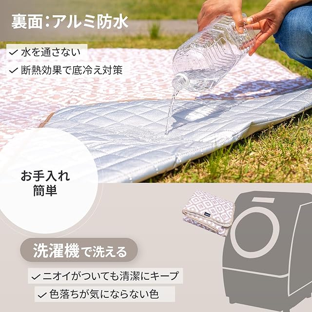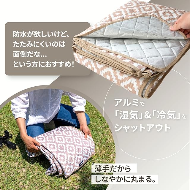 【3層構造】1)地面と接する裏面にアルミフィルムを使用しているため「防水性・断熱性・耐久性」に優れ、地面からの湿気や冷気をシャットアウトします。また、海水浴や川遊びで使う時に砂や草がくっつかずサラっと弾き返します。/2)真ん中に中綿が詰まっているため軽度のクッション性があります。/3)表面はポリエステルのサラサラとした素材ですので砂や草がくっつきにくいです。