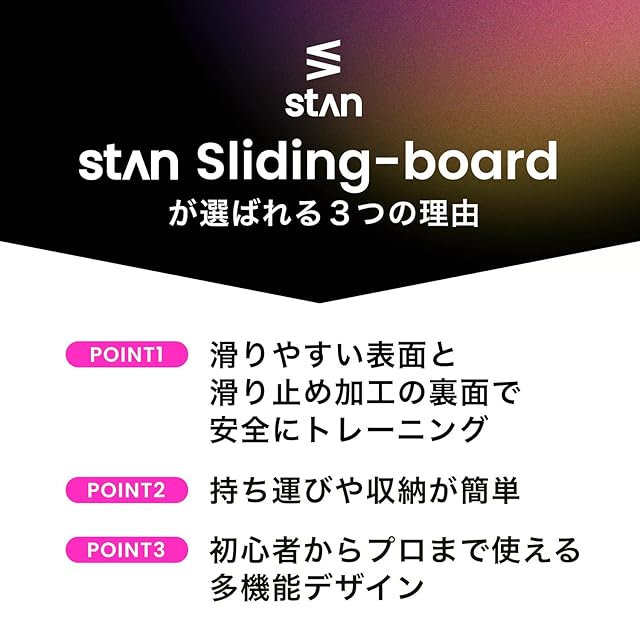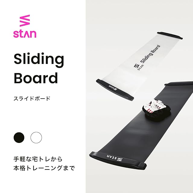 ✅【 下半身 筋トレ の決定版!15種目を載せた説明書付 スライドボード 】初心者も安心!自宅で手軽に本格スケート トレーニング ができる stan スライディングボード。「stʌn(スタン)」はフィットネスの専門家であるパーソナルトレーナーが10,000時間以上の指導経験を元に立ち上げたスポーツブランドです。stʌnでは「フィットネストレーナーの経験と独自視点から自信をもってお勧めできる商品しか扱わない」というシンプルなコンセプトのもと、良質な商品と安心を皆様にご提供し「フィットネスグッズを探すならstʌn」となれるよう信頼あるスポーツブランドを目指し商品展開をしています。 ✅【 効率よく楽しくトレーニングできる 】スライドボードの上で左右にスライディングするように動くことで体幹、下半身、バランス能力を効率よく鍛えることが可能です。また、スケートのような感覚なので楽しくトレーニングすることができるため、継続しやすいというメリットもあります。アスリートのようなトレーニングをしたい方はもちろん、室内で気軽に行えるダイエット器具としてもオススメのトレーニング器具です。 ✅【 豊富なトレーニングバリエーション 】左右にスライディングするだけでなく、様々な種類のトレーニングが可能です。本商品にはパーソナルトレーナーが監修した15種目ものトレーニング方法の記載がありますので、初心者の方でも使用方法やトレーニング方法に困ることなく安心してご使用いただけます。また、素早くスピード重視で行えば、下半身の強化や体幹の筋トレにもなりますし、ゆっくり長く行えば有酸素運動にもなります。ぜひ皆さんの目的に応じて使い分けてみてください。 ✅【 選べるサイズ!初級者から上級者まで体力レベルに合わせた設計 】本商品は180cmと230cmの2サイズがあります。スライディングボードの面がより長い方が難易度と強度が上がります。そのため、180cmは初級〜中級者用、230cmは中級〜上級者用となっています。ご自身の体力レベル、使用用途に合わせてご使用ください。 ✅【 充実の同梱内容 】本商品にはスライディングボード本体、専用シューズカバー、収納ネットのほかに日本語取扱説明書、ハンドカバーが同梱されております。そのため、ご購入いただければすぐにバリエーションに富んだトレーニングが開始できます。また、メーカー、日本人スタッフによるアフターサービスもご用意しておりますので、ご安心してお買い求めください。お子さんから大人まで楽しく行える家庭用筋トレグッズとして一家に1台いかがでしょうか。