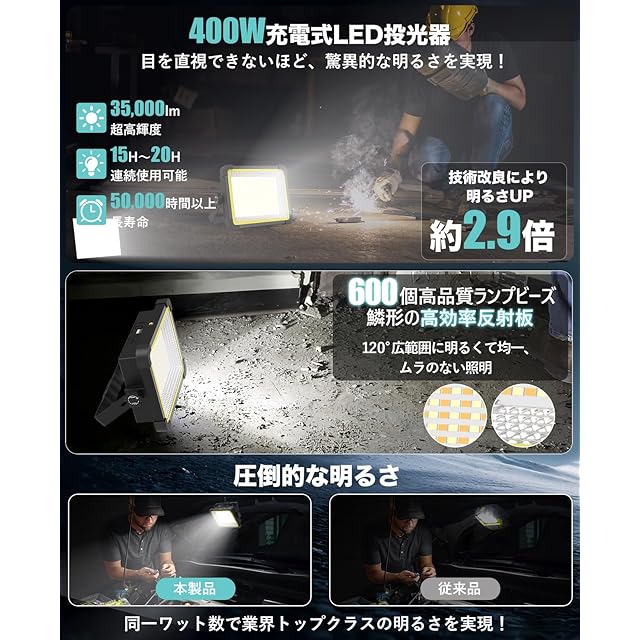 【最高輝度16H連続点灯・35,000lm超高輝度】投光器 充電式は、600個の高品質LEDランプビーズと鱗形の高効率反射板を採用し、技術改良により従来比約2.9倍の明るさを実現。このled ライト 作業灯は35,000ルーメンの超高輝度で、暗闇でも広範囲をくまなく照らします。16時間以上連続点灯で工事現場やキャンプ、災害時など、あらゆるシーンで大活躍!