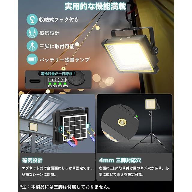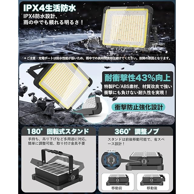 【IPX4生活防水・フック・磁気設計・三脚に取付可能】この充電式 led投光器 屋外は特製PC/ABS素材を採用し、耐衝撃性を43%向上させ、IPX4生活防水仕様で雨の日でも心配する必要はないです。また、led投光器 充電式は収納可能なフック、磁気設計、三脚に取付可能(4mm三脚対応穴あり)など、多様な機能を備えており、あらゆるシーンで活躍します。
