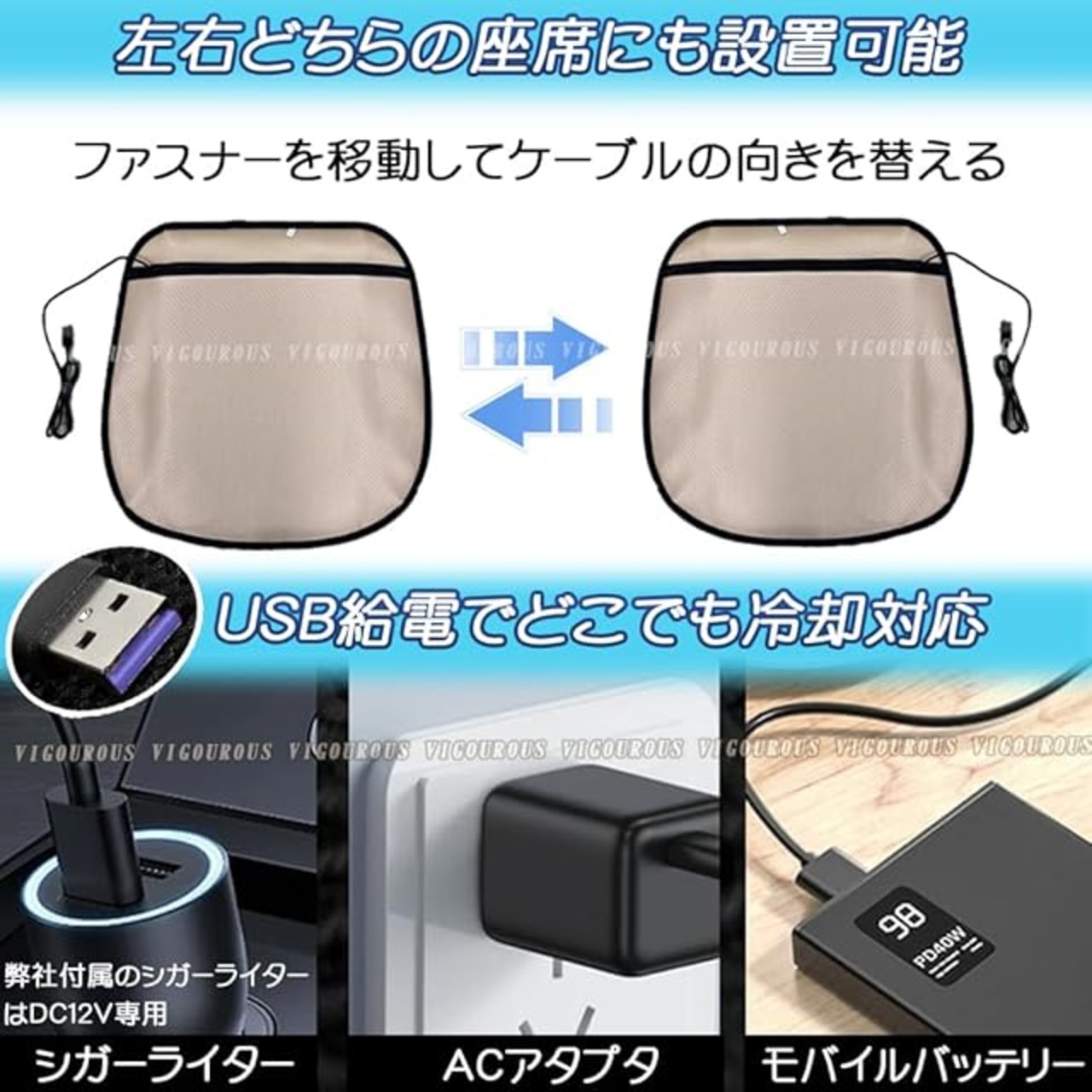 クールシートのサイズ:L49×W49cm、中央厚さ約1cm、重量:500g。USB給電口でPC/モバイルバッテリー/車載USBなど、あらゆる環境で電源確保可能。面倒な配線不要で、オフィス・車内・在宅ワークに最適です。また、DC12V用のシガーライターも付属しています。