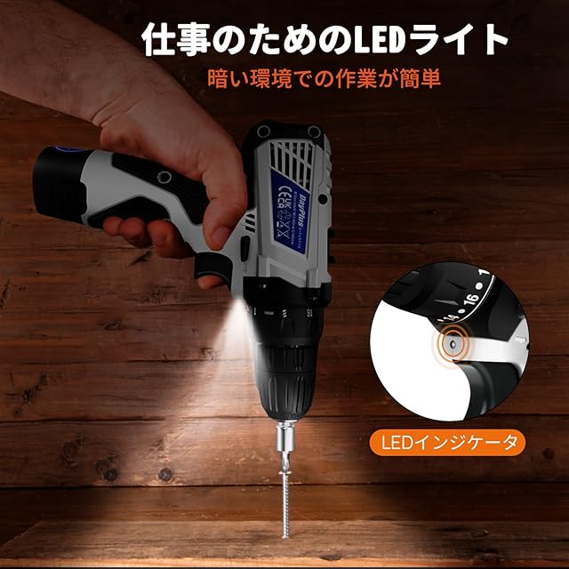 【独特のディザイン】1.コードレスのドリルドライバーですので、場所を選らずさまざまなシーンで大活躍です。2.バッテリー残量ランプ付きなので、一目で残量がわかります。3.また、すべり止めハンドルでもっと快適に使えます、グリップ性に優れて、長時間の作業でも疲れにくいで。4.明るくて小型のLEDライトが搭載したので、照明できて暗い場所でも楽にお使いいただけます、LEDライトで暗い部分の作業も快適。5.熱放散のための空気口で、あなたは連続的にしかし、どんな危険なしででもドリルを使うことができます。