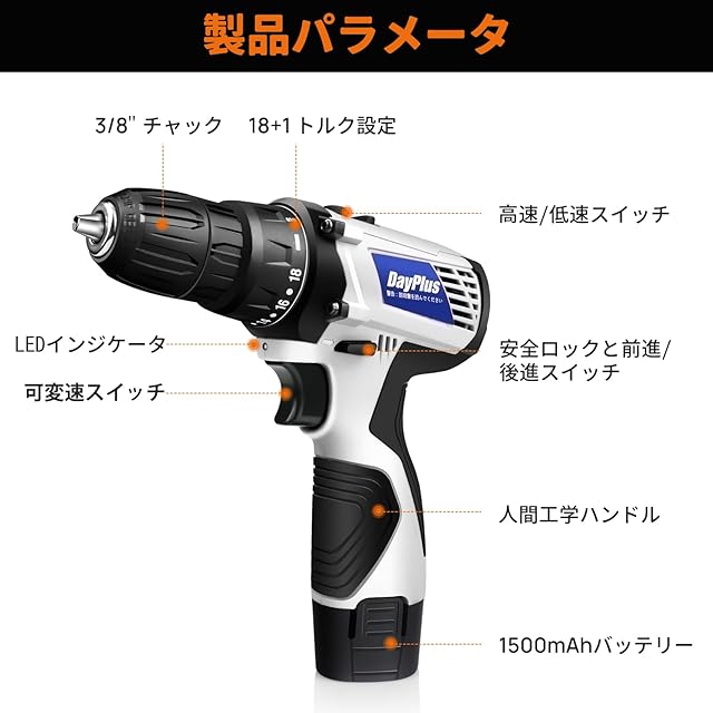 商品名:DayPlus 電動ドライバー 電動ドリル 16.8V 1500mAhバッテリ 18+1段階トルク調節 最大35N.m 2段変速0-350RPM/0-1400RPM 安全ロック 正逆切替 コードレス LED照明 過負荷保護 過熱保護 放電保護 収納ボックス付き 木工用 LED残量表示 小型 軽量 DIY 家具の組 み立て 日本語取扱説明書