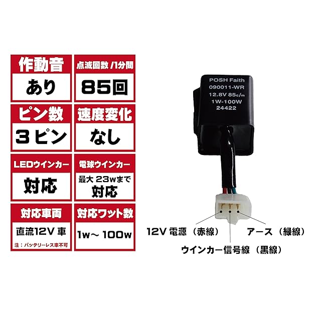 商品名:ポッシュフェイス(POSH FAITH) ポッシュ(POSH) バイク用品 ワイドワットウインカーリレー(LED対応) 3線式 090011-WR