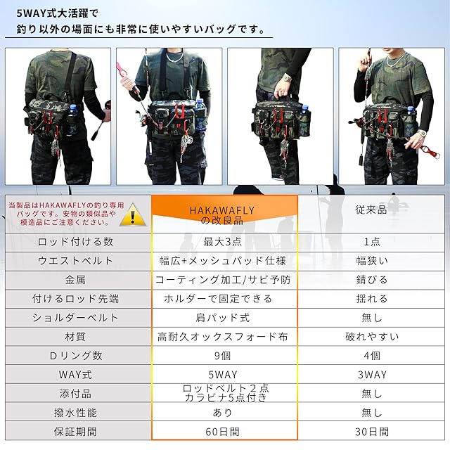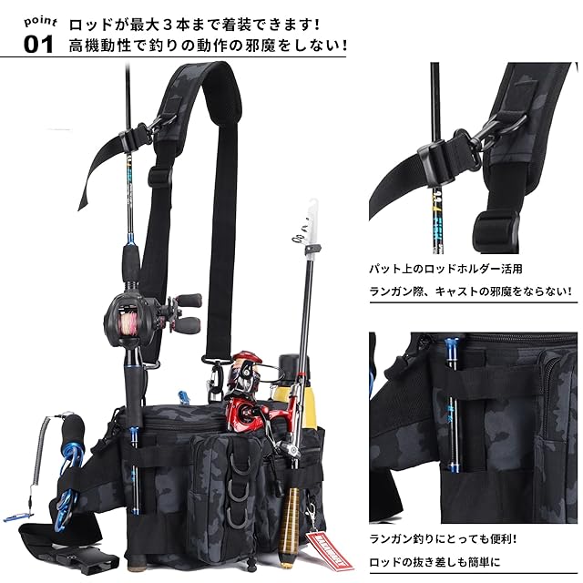【最新版フィット感・固定感UPの釣り バッグ】釣り ウエストバッグを身に着けた状態で「ズレ落ちにくく」フィット感・固定感が弊社は重視設計としました。ウエストベルトの端末には蒸れに強いメッシュパッド仕様に従来品より幅広いウエストベルト(5cm)ですっきりとした、腰にしっかりとフィットして、ブレない釣り ヒップバッグ。5WAY式、フィッシングバッグ・ショルダーバッグ ・ ウエストバッグ ・ ハンドバッグ ・ メッセンジャーバッグ としてもおすすめです。ロッドベルト2点とカラビナ5点付きで最大3点のロッドを固定でき,タモ網も簡易ロッドホルダーを利用可能です。
