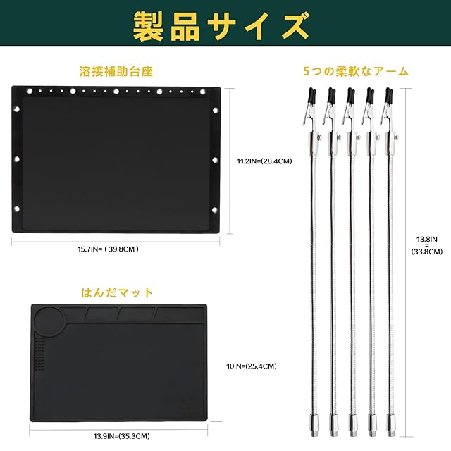 【プロフェッショナルはんだ付けマットベース】:ベースは底板とはんだ付けマットで構成されており、サイズは40×28センチ(15.7×11インチ)で、従来の金属製はんだ付け補助具のベースよりも大きく、安定しています。プロフェッショナルなはんだパッドデザインで、はんだ付けのために設計された多機能ワークスペースで、さまざまなはんだ、修理、その他のジュエリーはんだ付けキットを置くことができます