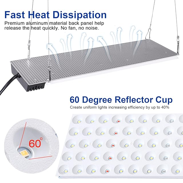 【60度リフレクターカップ】この成長ライトは、均一な光を生み出し、効率を最大40%向上させる60度のリフレクターカップを特徴としています。
