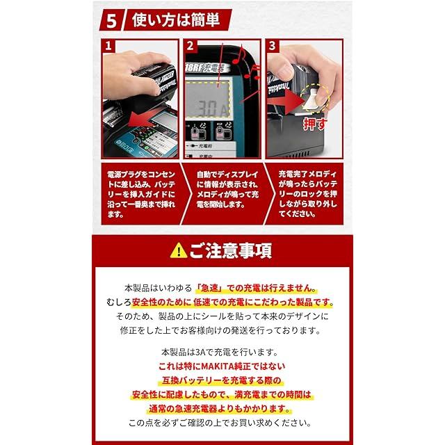 【冷却ファン&ヒートシンク構造で安全性に配慮】通常の充電よりもゆっくりと充電を行うので、バッテリーに負担をかけません。特に互換バッテリーを急速充電器で充電するのは危険とされているので、互換バッテリーには互換充電器をオススメいたします。冷却ファンも備え、内部構造はヒートシンク構造と、徹底的に「安全」「あんしん」にこだわりました。※純正充電器よりも満充電までに時間がかかることはご承知ください。
