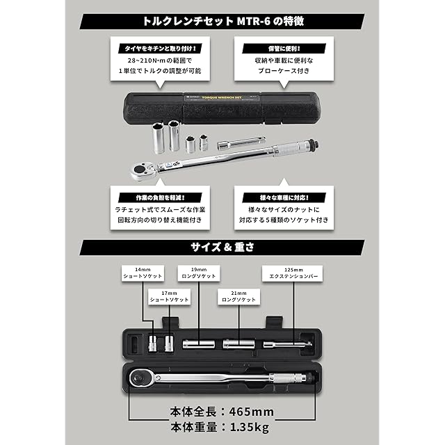 セット内容:トルクレンチ本体、ショートソケット(14mm・17mm)、ロングソケット(19mm・21mm)、エクステンションバー125mm