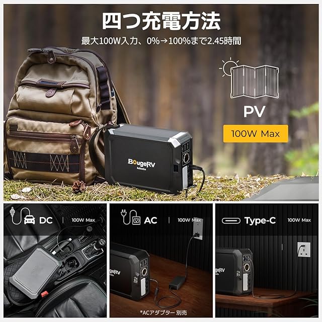 【多様な充電方法】AC、シガーソケット、ソーラーパネル、USB-Cの4つの方法で充電可能。さらに、USB-C入力は最大100Wに対応しており、スマホのアダプターでも簡単に充電可能。