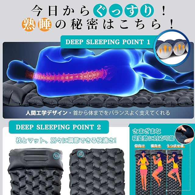 【一体型枕・安眠サポート】HIKENTUREエアーマットは枕一体型設計で、別途枕を持ち運ぶ必要なし。人間工学に基づいた枕が首をしっかりサポートし、キャンプ中でも家のような快適な睡眠を実現。展開サイズ190×60×7cm、枕とマットのエアバルブ独立で高さ調整可能。仰向け・横向けでも自然な姿勢を保ち、一日の疲れを癒します。