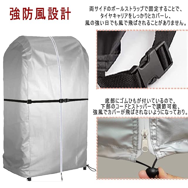 【防風対策】裾のところに調節可能なコードロック付き。コードロックで絞れるので、両サイドにボールバンドで固定できて、調節可能な弾性防風ベルトが付いています、屋外の強風でもしっかりタイヤラックをカバーできますが吹き飛ばされることはなく、安全に保管してタイヤを固定することができます。