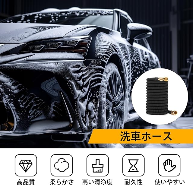 【高品質の素材を使用】散水ホースの内層には、優れた伸縮性と回復力を持つ2mm厚の高品質ラテックスを採用しており、これにより耐久性が大幅に向上し、使用時の伸縮もよりスムーズになります。外層は耐摩耗性に優れたポリエステル繊維で作られており、硬い地面で引きずっても内側のラテックスが傷つかないように保護されています。 弊社の目標はより良い顧客体験を提供することです。使用中に何か問題や質問があった場合は、いつでもお問い合わせください。