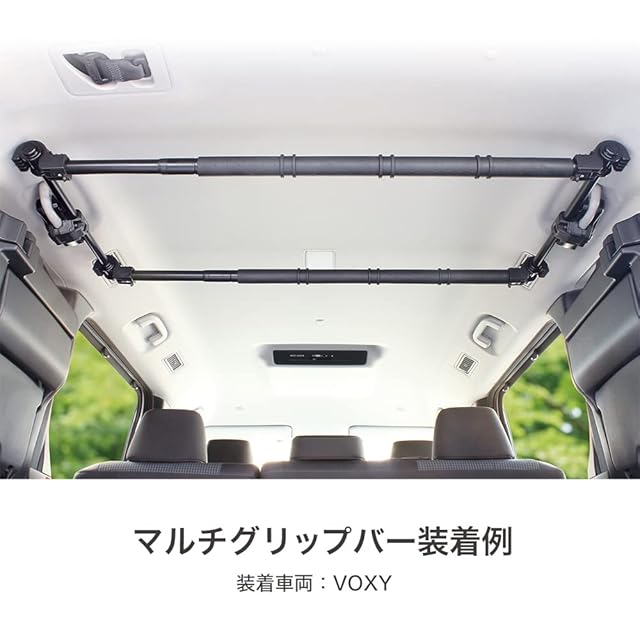 ●アシストグリップ左右一対だけで車内用バーの前後2本掛けができます。