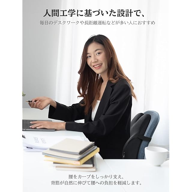 人間工学に基づく:腰をカーブをしっかり支え、背筋が自然に伸びて腰への負担を軽減します。長距離を車での移動時に使用するだけではなく、長時間のデスクワークなどにも使えます。長時間椅子に座って作業することが多い方におすすめのランバーサポート。