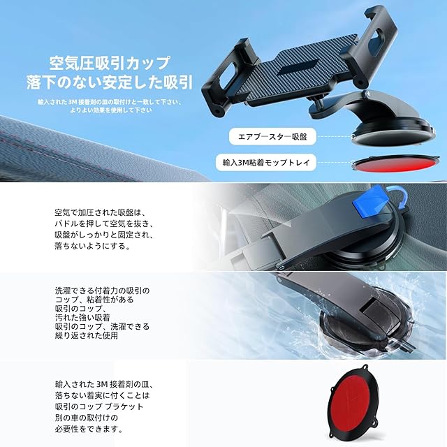 【取り付けが簡単】サイドボタンを片手で長押しすると、両側の翼がゆっくりと開き、片手操作が簡単で便利です。粘着性のある強力なゲル吸盤により、細かい凹凸のあるダッシュボードにも直接取り付けられます。また、3M接着剤を使用しており、ダッシュボード、フロントガラスから剥がす場合は、ゲルの糊残りが一切なし、簡単かつきれいに取れます。また接着力が弱まってきたら、水洗いして乾燥させるだけで接着力が回復します!繰り返し何回でも利用可能です。