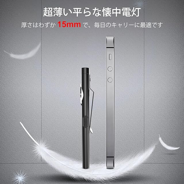 【コンパクトでフラットなデザイン 】 E5トーチはコンパクトなデザインのスティックを採用しています。トーチのサイズは約10.6X2.5X1.5cm、わずか約35.8g、超小型軽量で、フラットなデザインはポケットやバッグが膨らむのを防ぎ、より省スペースで持ち運びやすくなります。