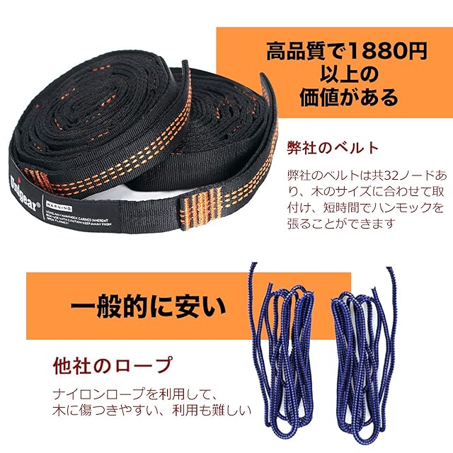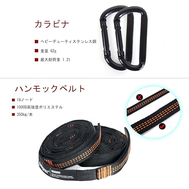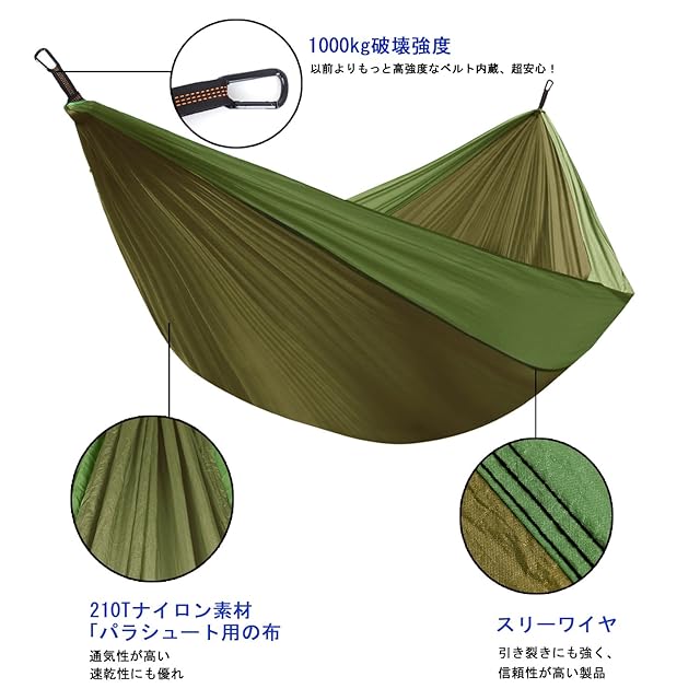 【高耐久高品質】高耐久、高品質のパラシュートナイロンを採用しています。耐荷重はなんと350キロ!大人5人で乗っても大丈夫なのです「弊社の社員5人で乗られます」 。1㎏ぐらいで女性でも気軽に持ち運べます。常に車に積んでおいてもOK。ベルトはハンモックで内蔵し、ベルトの購入のは必要ありません!ハンモックの初心者に最適です!」。D型カラビナも付きます。