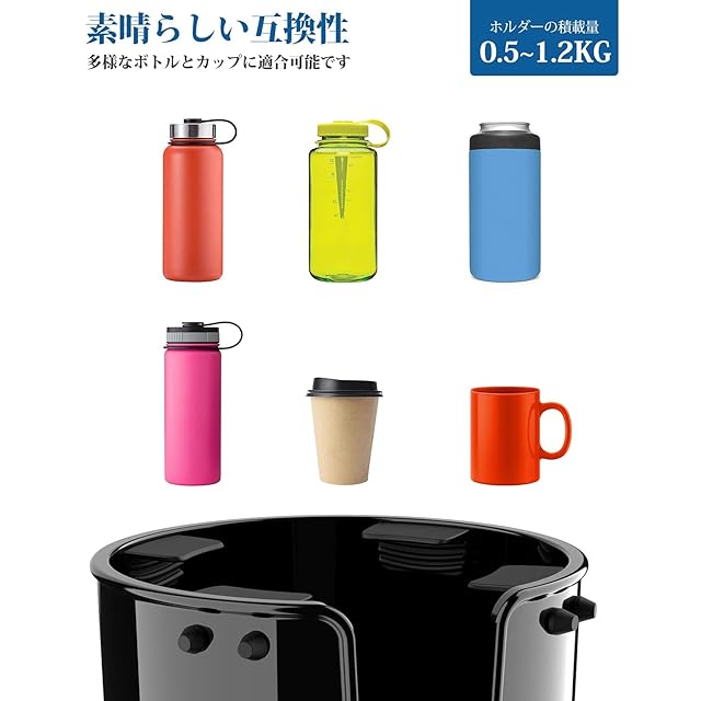 【広範な互換性】8.6から9.4cm径のボトルに対応し、多様なボトルやカップを収納できます。ご注意:大きなボトルを入れる前に、ラバータブを取り除いてください。