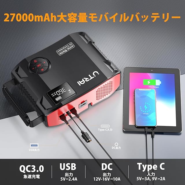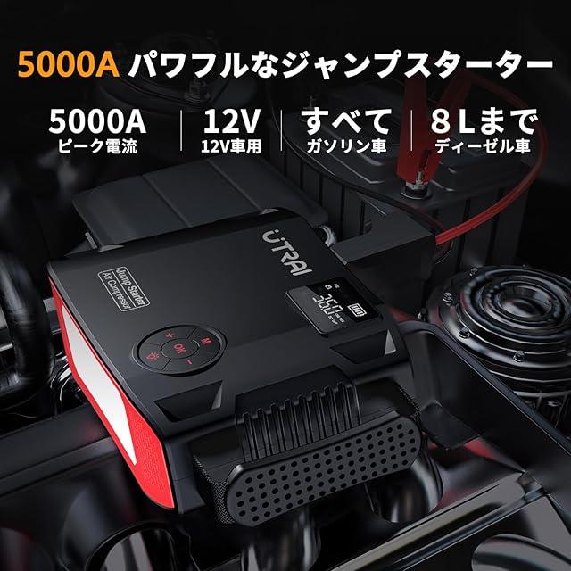 商品名:UTRAI ジャンプスターター 27000mAh 電動空気入れ エンジンスターター ピーク電流5000A バッテリー上がり対策 DC/USB出力搭載 安全保護機能 LED緊急ライト モバイル電源 QC3.0急速充電 すべてガソリンエンジン車 8Lまでディーゼル車 PSE認証済 Jstar 5
