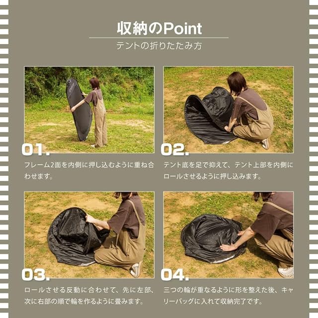 キャンプ、ビーチ、イベント、防災用など着替えスペースを確保するポップアップテント。自動的に広がり、わずか20秒ほどで完成します。フロントシート(扉)を閉じればフルクローズ、プライバシー保護が図れます。高さ190㎝仕様。広さは約1㎡で簡易トイレの設置も可能。防災時のトイレは必要不可欠。普段から備えておくと安心です。 フレームはスチール製の薄板ワイヤーバネ。形状弾性の特性を取り入れて、シートと一体化したテントはホップアップして展開します。ワイヤーバネは負荷を分散して折れに強く、しかも軽量素材です。4隅にペグ打ちをして固定します。 シートはポリエスレルのオックスフォード織。厚地ですが通気性に優れます。上部には通気口、裏面はシルバーコーティングで遮光性を高めてUVカット、遮熱効果もあり。生地は防水仕様で安心です。ダブルファスナーで内外両側から開閉、タッセルで巻き止めできます。便利なインナーポケット、ハンガーバンド付き。 収納時はワイヤーのバネが丸くなる弾性で、素早く3層の輪状に折り畳めます。約Ø58×H3㎝のフラット収納。約1.7kgの超軽量。持ち運びやすい便利なキャリーバッグ付き。