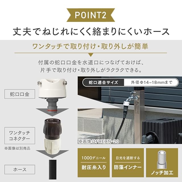 口金適合サイズ:丸形口金外形14~18mm※付属の蛇口口金は、口が四角い、口がねじ式、口に泡沫、整流キャップが付いているタイプの蛇口には使用できません。 / ※その他にも取り付けられないものがありますのでご注意ください。 / ※瞬間湯沸器には使用しないでください。