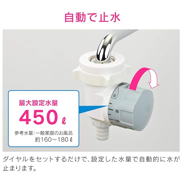 最大設定水量:450L、使用温度:1~50度、使用圧力:0.1~0.3MPa、材質:ABS樹脂、ポリアセタール