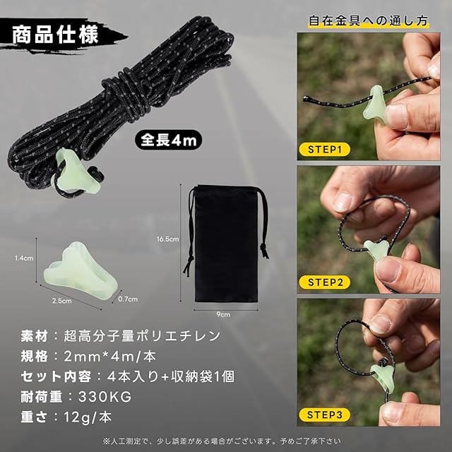 商品名:ガイロープ テントロープ ダイニーマ タープロープ 2mm 耐荷重330KG 高強度な素材 反射 蓄光 自在金具付き 軽量 長さ4m 長さ4m キャンプ ロープ アウトドア 収納袋付き (ブラック4本入り)