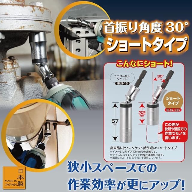 商品名:トップ (TOP) 電動ドリル用 ユニバーサルショートソケット 対辺13㎜ 首振り30° 全長84.5㎜ EUS-13S 燕三条 日本製