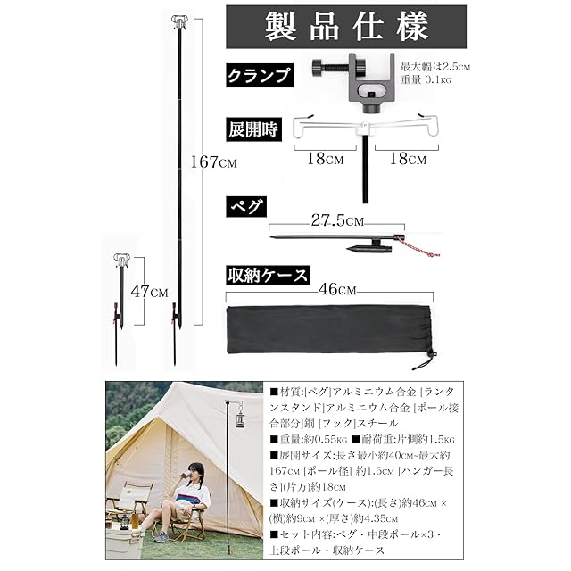 【2way 軽量、持ち運びが便利です】ランタンスタンドはコンパクトで軽量で、収納袋に入れて簡単に収納できます。ランタンポール収納後の長さは45cm、重さは0.55kg、ポール径約1.6cm。ソロキャンプの際にも持ち運びが容易です。耐荷重は約3kg。ほとんどのキャンプライト(イルランタン、ハリケーンランプ、灯油ランタン、LEDランタン)の重量は約0.5kg~2kgなので、使用に適しています!(注:製品はランタンスタンドであり、キャンプライトは含まれません)