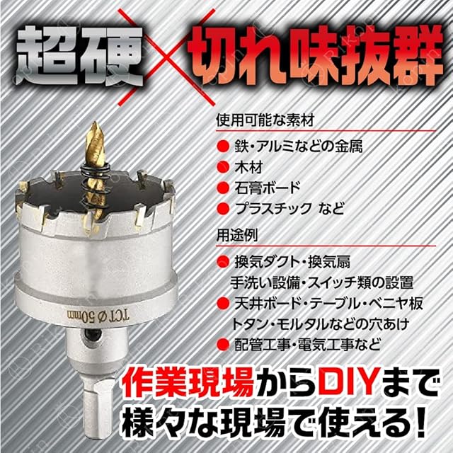 【仕様】 ・サイズ:55mm 50mm 45mm 35mm 30mm 25mm 22mm 20mm 18mm 16mm ※中心のドリルにはスプリング付き。切断した鉄材を除去のアシスト。 ・センタードリル径:6mm ・付属品:専用アルミケース