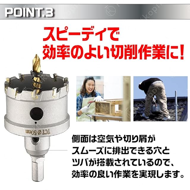 更銅チップ付きで切れ味抜群!また、切屑を排出する穴があるため切屑をスムーズに排出します。