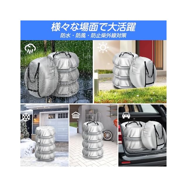 【全天候対応・多機能タイヤカバー】あなたのタイヤを守る完璧な保護アイテム!屋外や屋内での保管に適しており、紫外線・雨水・雪・ほこり等からタイヤをしっかり守ります。特に長期間使用しない予備タイヤや、季節ごとに交換するタイヤの劣化を防ぎ、いつでもベストな状態で保つことができます。軽量でコンパクトなデザインにより、収納も簡単で、使わない時は車内や収納スペースに簡単に収めることができます。