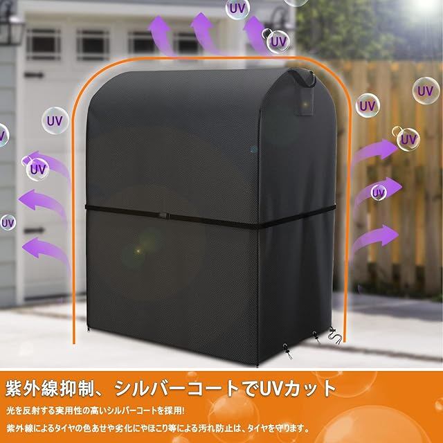 【商品仕様・品質】 屋外タイヤカバーのサイズ長さ110×幅75×高さ145cmで、タイヤを4本保管でき、適した車種はSUV車である。商品内容(タイヤラック専用カバー:1枚、収納袋:1枚、ボールベルト:4個、防風ロープ:1本)また、収納袋が付いているので、使わない時でも簡単に収納できるのでコンパクトで持ち運びに便利でスペースもとりません。※ここではタイヤラックカバーしか売っていません。タイヤホルダー本体は付属していません。あらかじめご了承ください。商品の購入日から12ヶ月間の品質がありますので、ご安心ください!商品の破損などの問題があれば、速やかに弊社にご連絡してください。タイヤ保管カバー使用中に何か問題が発生した場合、たとえ製品を開封していても、本製品の交換、返品、返金に応じます。24時間対応のカスタマーサービス、お気軽にお問い合わせください。