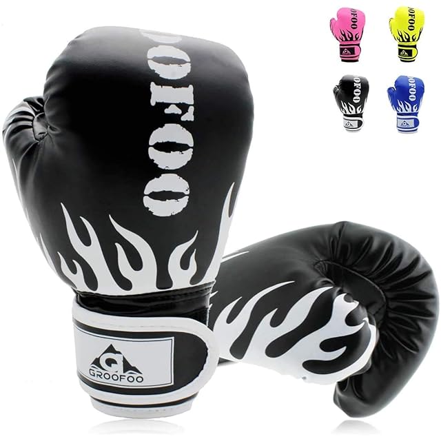 ボクシング グローブ 子供用 GROOFOO パンチ スパーリング 子供用 高級PUレザー 軽量 格闘技 打撃 空手 親子 トレーニング ストレス解消 ボクサー 特訓 通気性 (ブラック6oz)