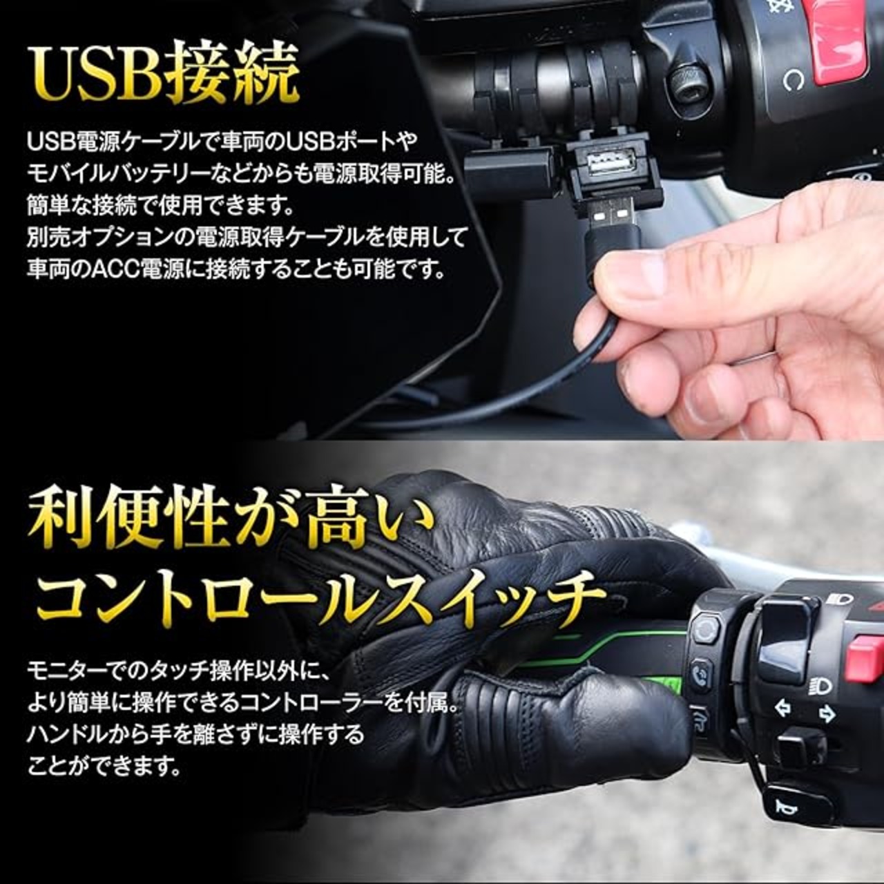 【USBで電源取得可能!数々の耐久テストをクリアした高耐久CarPlay/Android Auto対応バイク用ディスプレイオーディオ】 USB接続で簡単に使用できる、お手軽なバイク用ディスプレイオーディオ。 スマートフォンとワイヤレス接続するだけで、スマートフォンに入っているナビアプリや音楽をディスプレイオーディオ上で使用できるようになります。