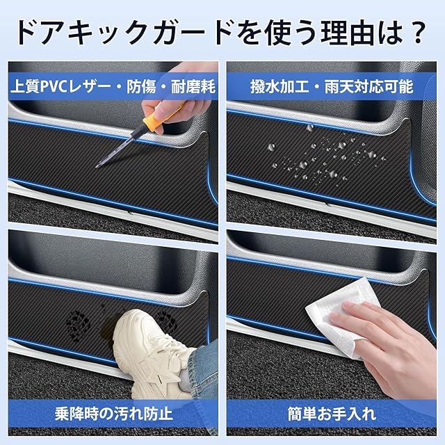 2.【キズや汚れからご愛車を守る】:車の乗り降りでついてしまうキズや汚れ、ドアの開閉時に付着する雨や風の汚れからしっかり保護!完全車種別専用設計のキックガード&ドアプロテクターで、ピッタリ装着で長期使用も安心。気づかないうちについてしまうキズや汚れをしっかりガードし、車内をクールで快適な空間に保ちます。いつもの車内を、より優れたスペースに変えるアイテムです。