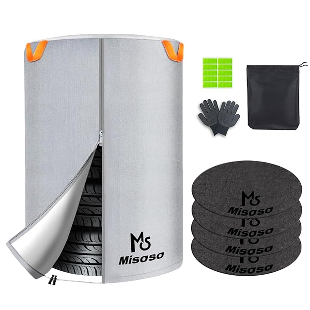 Misoso タイヤカバー 屋外 厚手420D フェルトパッド4枚付き タイヤ収納 4本 夜間反射 防水 紫外線 劣化 汚れ防止 耐久 雨雪対応 タイヤ保管カバー 収納袋・滑り止め手袋・反射テープ・シール付き (銀, S(65*90CM))