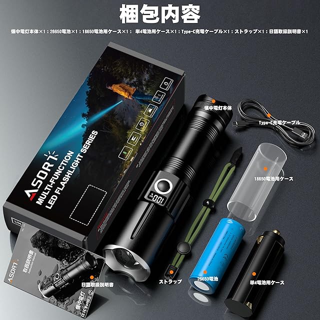 商品名:懐中電灯【新登場 記憶機能 液晶画面デジタル残量 ledライト 】 強力 軍用 最強 超高輝度 2000000ルーメン 超長遠射 明るいライト 多機能調光 ズーム式 手持ちライト 軽量 作業ライト USB充電式 ハンドライト 電池式 フラッシュライト 新型 大容量 作業灯 IPX6防水 防災 地震 停電対策 応急手当品 登山 釣り キャンプ へっとライト