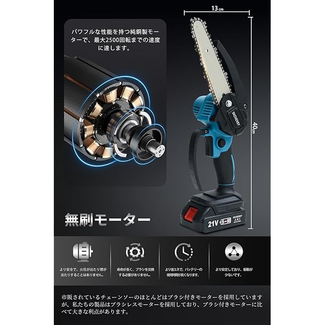 商品名:チェーンソー 充電式 ブラシレスモーター コードレス 電動ノコギリ 充電式チェーンソー ハンディチェーンソー 2つのバッテリー ハンドチェーンソー ポータブル ミニ 小型チェーンソー 電動のこぎり 日本語取扱説明書 2セットのガイドバーとチェーン BLUE-A